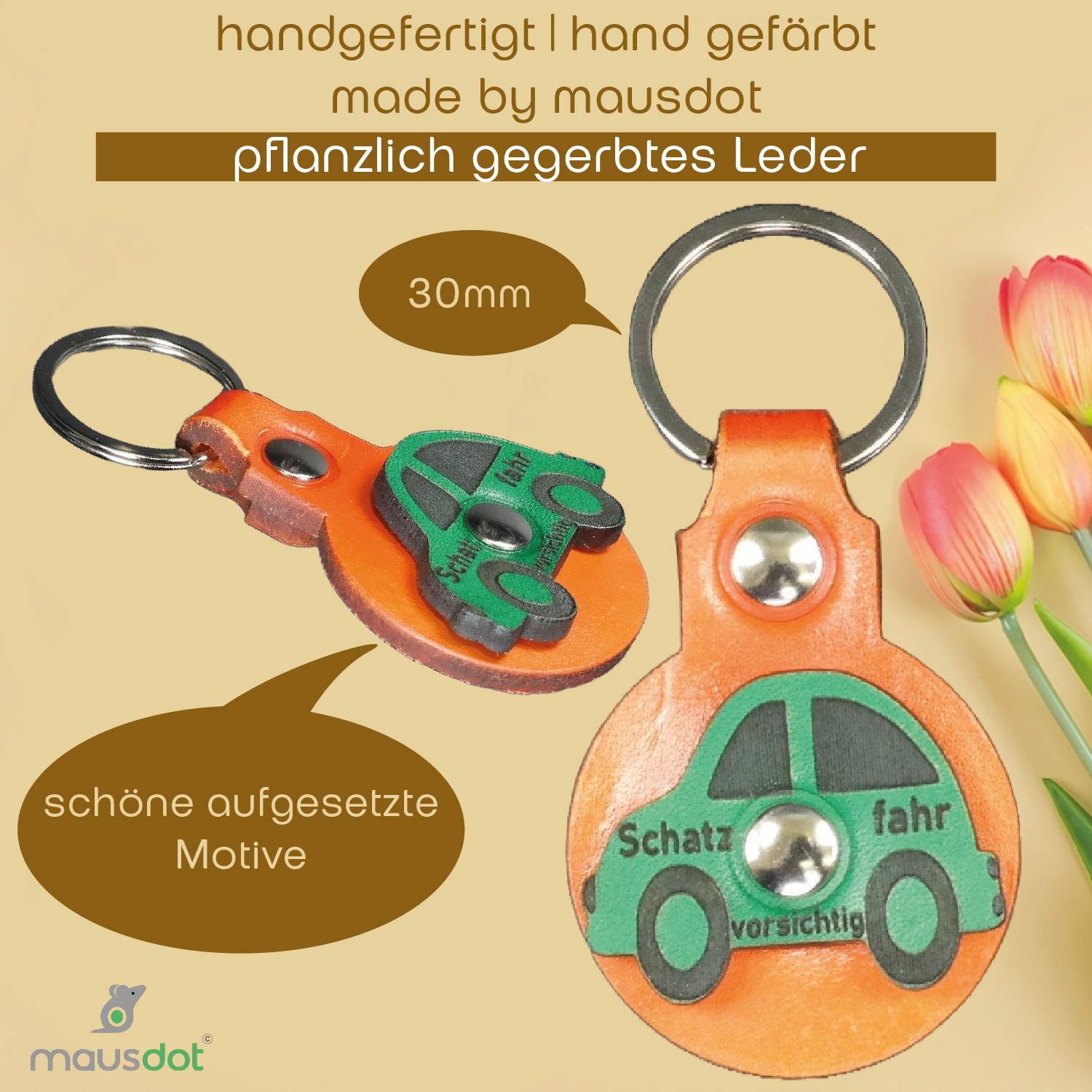 Der Mausdot Schlüsselanhänger mit einem fröhlichen Automotiv aus orangem und grünem Leder wird bei uns in Steinfurt komplett selber produziert. Wir gestallten alle Schlüsselanhänger selber. Der Schlüsselanhänger aus vegetabilem Leder wird sorgfältig von Hand gefärbt und zum Abschluss mit einem speziellen Micro Wachs gegen Abfärben und Wasser geschützt. Der Lederschlüsselanhänger mit dem Automotive und dem Text SCHATZ FAHR VORSICHTIG ist ein echter Hingucker und ein wunderschönes Geschenk für alle Anlässe.