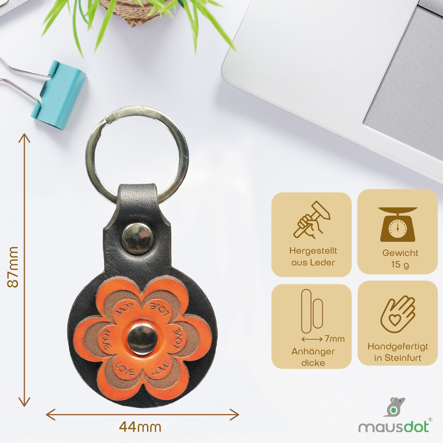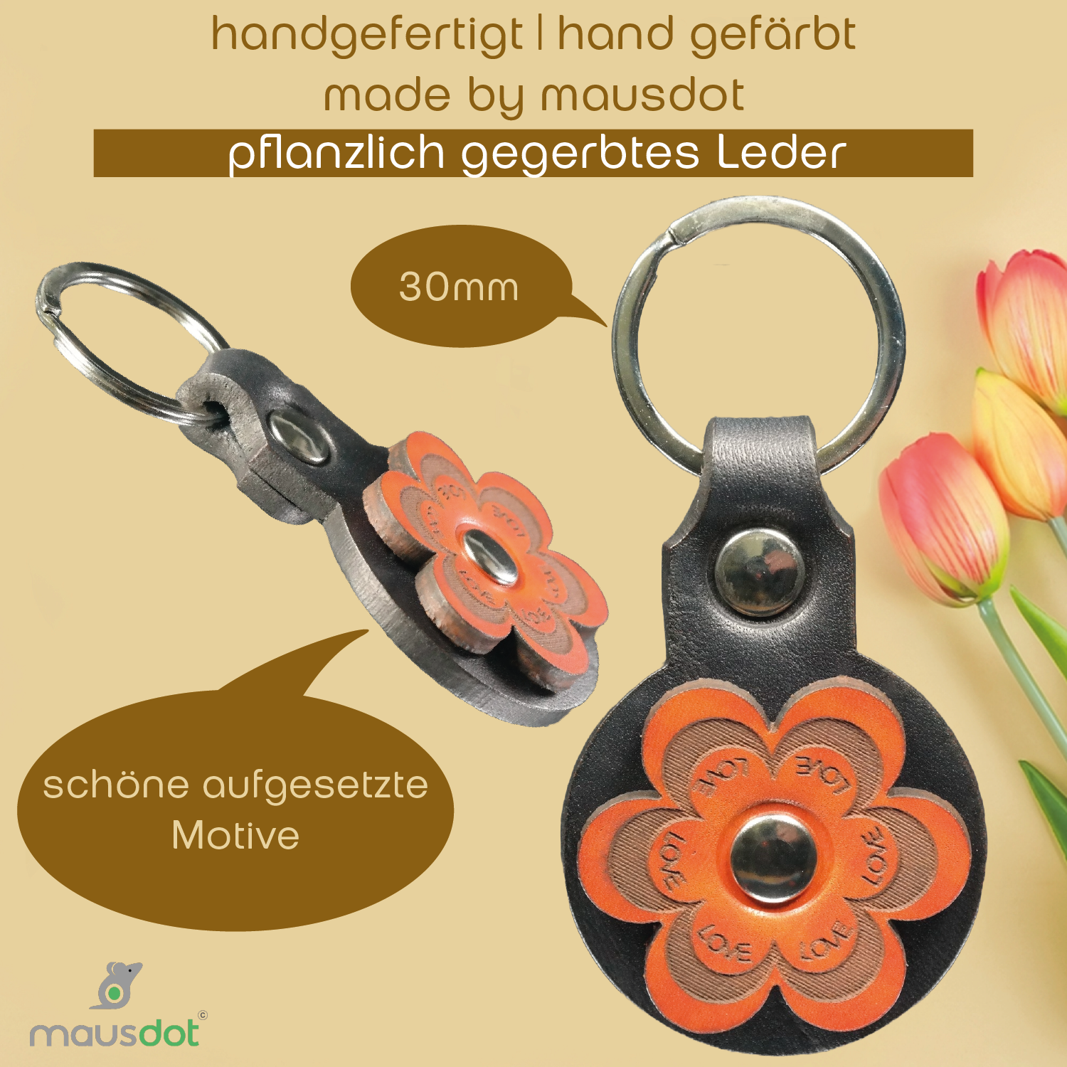 Der Mausdot Schlüsselanhänger mit einem fröhlichen Blumenmotiv aus schwarzem und orangenem Leder wird bei uns in Steinfurt komplett selber produziert. Wir gestallten alle Schlüsselanhänger selber. Der Schlüsselanhänger aus vegetabilem Leder wird sorgfältig von Hand gefärbt und zum Abschluss mit einem speziellen Micro Wachs gegen Abfärben und Wasser geschützt. Der Lederschlüsselanhänger mit dem Blumenmotive und dem Text LOVE ist ein echter Hingucker und ein wunderschönes Geschenk für alle Anlässe.
