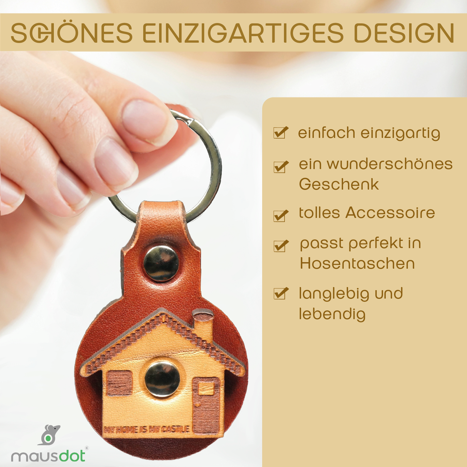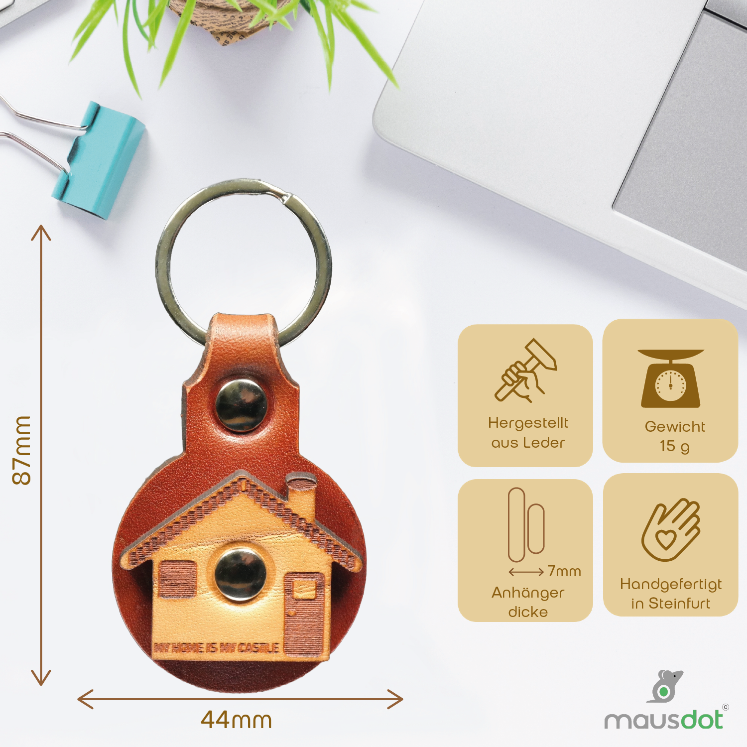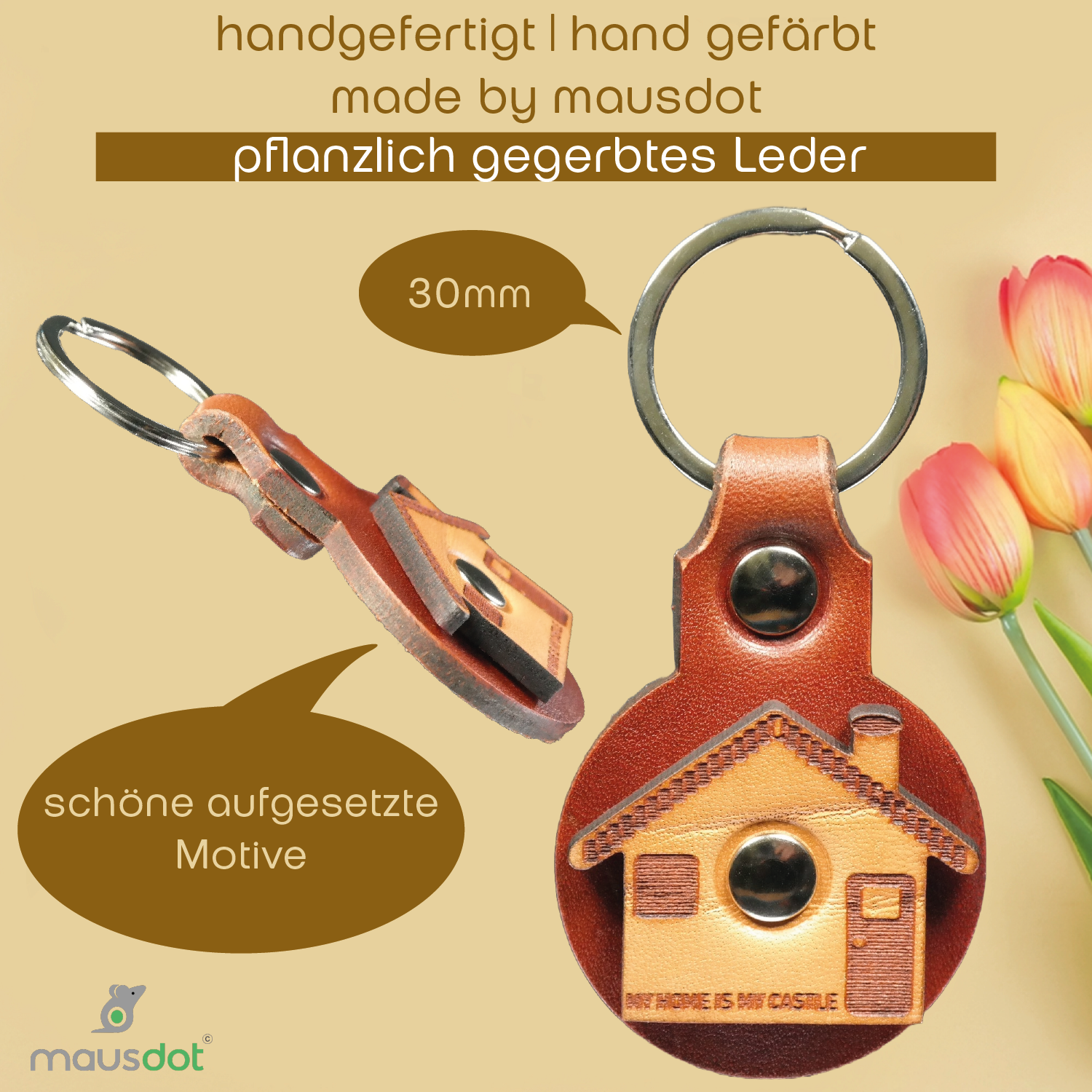 Der Mausdot Schlüsselanhänger mit einem fröhlichen Hausmotiv aus dunkelbraunem und beigem Leder wird bei uns in Steinfurt komplett selber produziert. Wir gestallten alle Schlüsselanhänger selber. Der Schlüsselanhänger aus vegetabilem Leder wird sorgfältig von Hand gefärbt und zum Abschluss mit einem speziellen Micro Wachs gegen Abfärben und Wasser geschützt. Der Lederschlüsselanhänger mit dem Hausmotive und dem Text MY HOME IS MY CASTLE ist ein echter Hingucker und ein wunderschönes Geschenk für alle Anlässe.