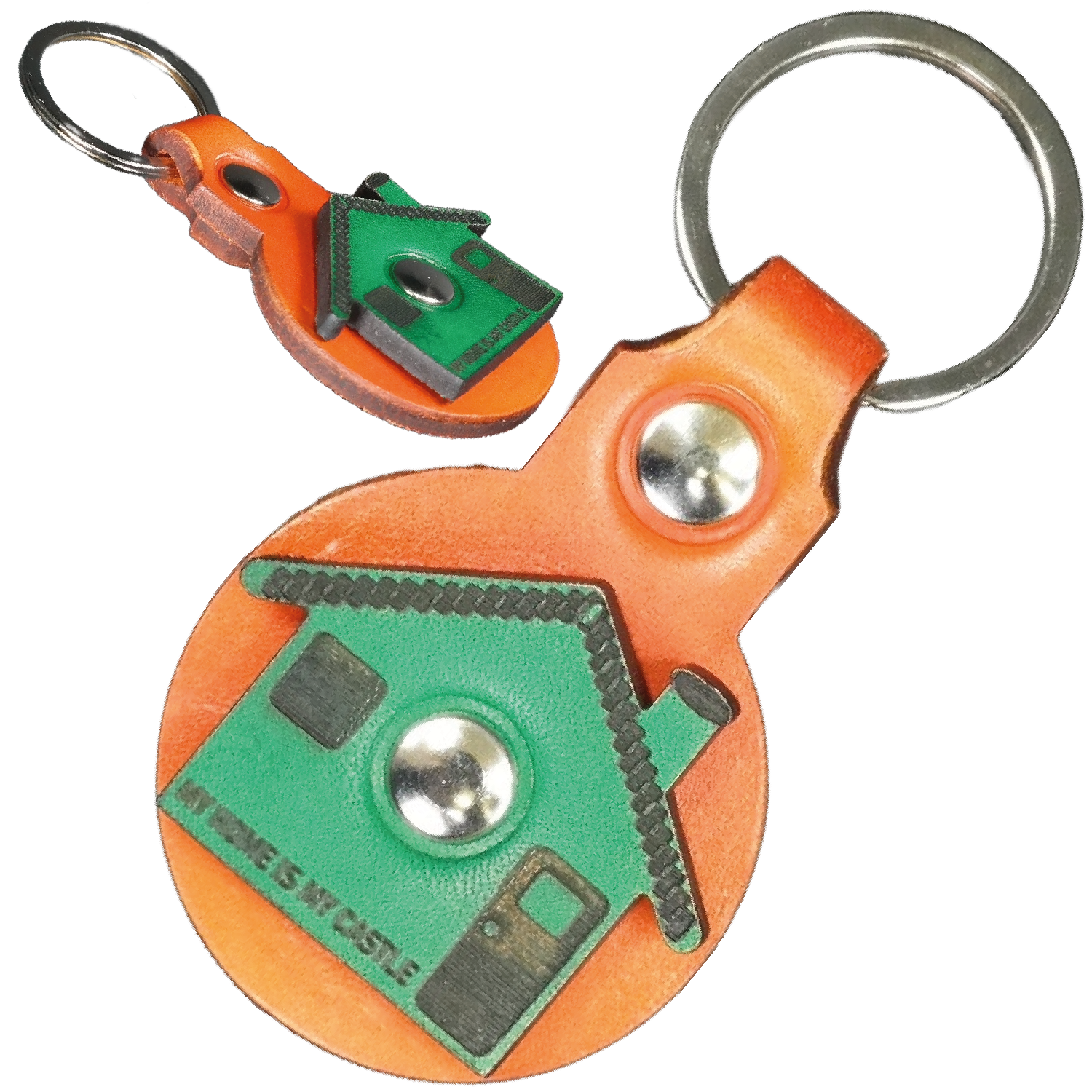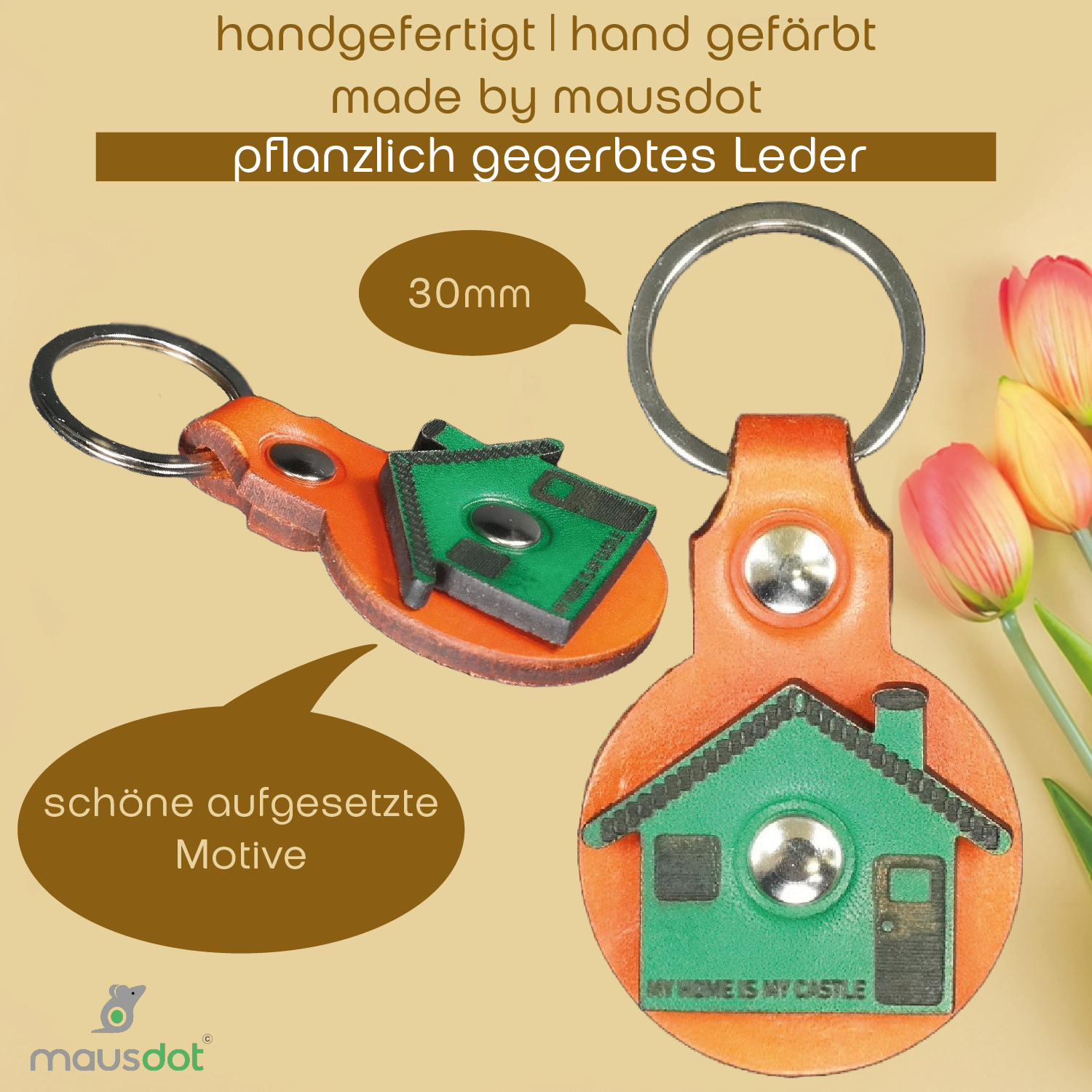 Der Mausdot Schlüsselanhänger mit einem fröhlichen Hausmotiv aus orangem und grünem Leder wird bei uns in Steinfurt komplett selber produziert. Wir gestallten alle Schlüsselanhänger selber. Der Schlüsselanhänger aus vegetabilem Leder wird sorgfältig von Hand gefärbt und zum Abschluss mit einem speziellen Micro Wachs gegen Abfärben und Wasser geschützt. Der Lederschlüsselanhänger mit dem Hausmotive und dem Text MY HOME IS MY CASTLE ist ein echter Hingucker und ein wunderschönes Geschenk für alle Anlässe.