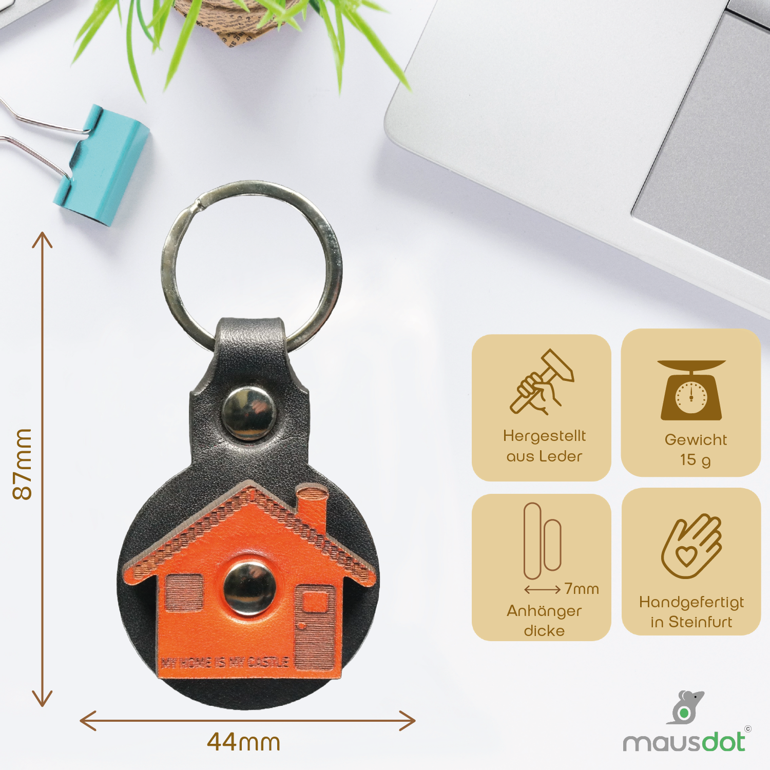 Der Mausdot Schlüsselanhänger mit einem fröhlichen Hausmotiv aus schwarzem und orangenem Leder wird bei uns in Steinfurt komplett selber produziert. Wir gestallten alle Schlüsselanhänger selber. Der Schlüsselanhänger aus vegetabilem Leder wird sorgfältig von Hand gefärbt und zum Abschluss mit einem speziellen Micro Wachs gegen Abfärben und Wasser geschützt. Der Lederschlüsselanhänger mit dem Herzmotive und dem Text MY HOME IS MY CASTLE ist ein echter Hingucker und ein wunderschönes Geschenk für alle Anlässe.