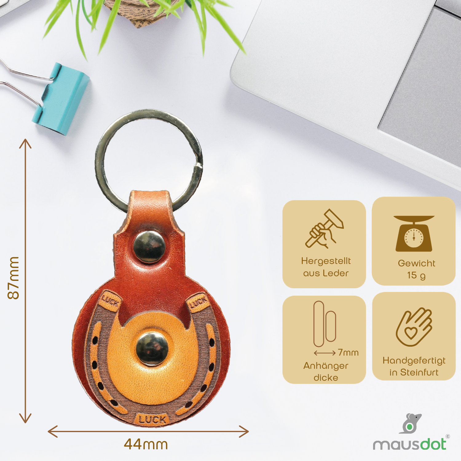 Der Mausdot Schlüsselanhänger mit einem fröhlichen Hufeisenmotiv aus dunkelbraunem und beigem Leder wird bei uns in Steinfurt komplett selber produziert. Wir gestallten alle Schlüsselanhänger selber. Der Schlüsselanhänger aus vegetabilem Leder wird sorgfältig von Hand gefärbt und zum Abschluss mit einem speziellen Micro Wachs gegen Abfärben und Wasser geschützt. Der Lederschlüsselanhänger mit dem Hufeisenmotive und dem Text LUCK ist ein echter Hingucker und ein wunderschönes Geschenk für alle Anlässe.