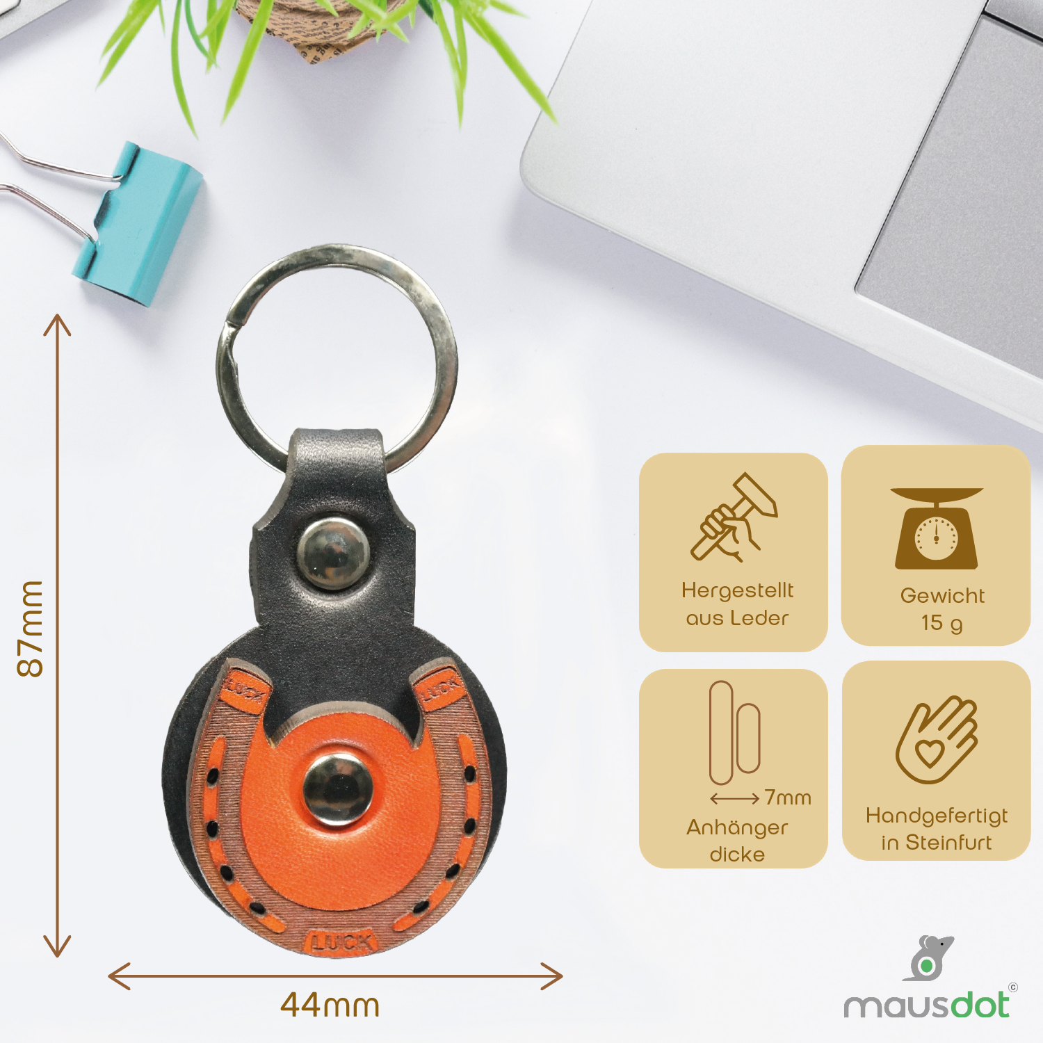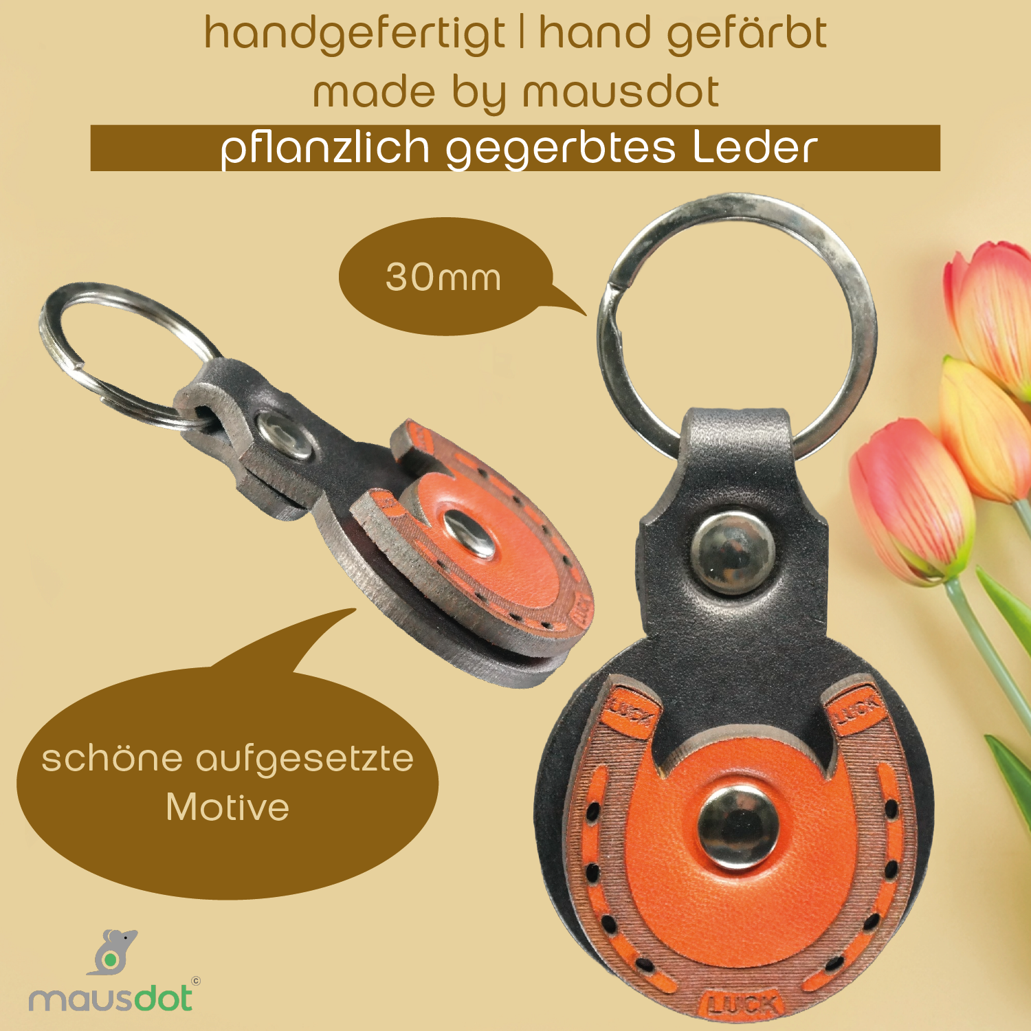 Der Mausdot Schlüsselanhänger mit einem fröhlichen Hufeisenmotiv aus schwarzem und orangenem Leder Leder wird bei uns in Steinfurt komplett selber produziert. Wir gestallten alle Schlüsselanhänger selber. Der Schlüsselanhänger aus vegetabilem Leder wird sorgfältig von Hand gefärbt und zum Abschluss mit einem speziellen Micro Wachs gegen Abfärben und Wasser geschützt. Der Lederschlüsselanhänger mit dem Hufeisenmotive und dem Text LUCK ist ein echter Hingucker und ein wunderschönes Geschenk für alle Anlässe.