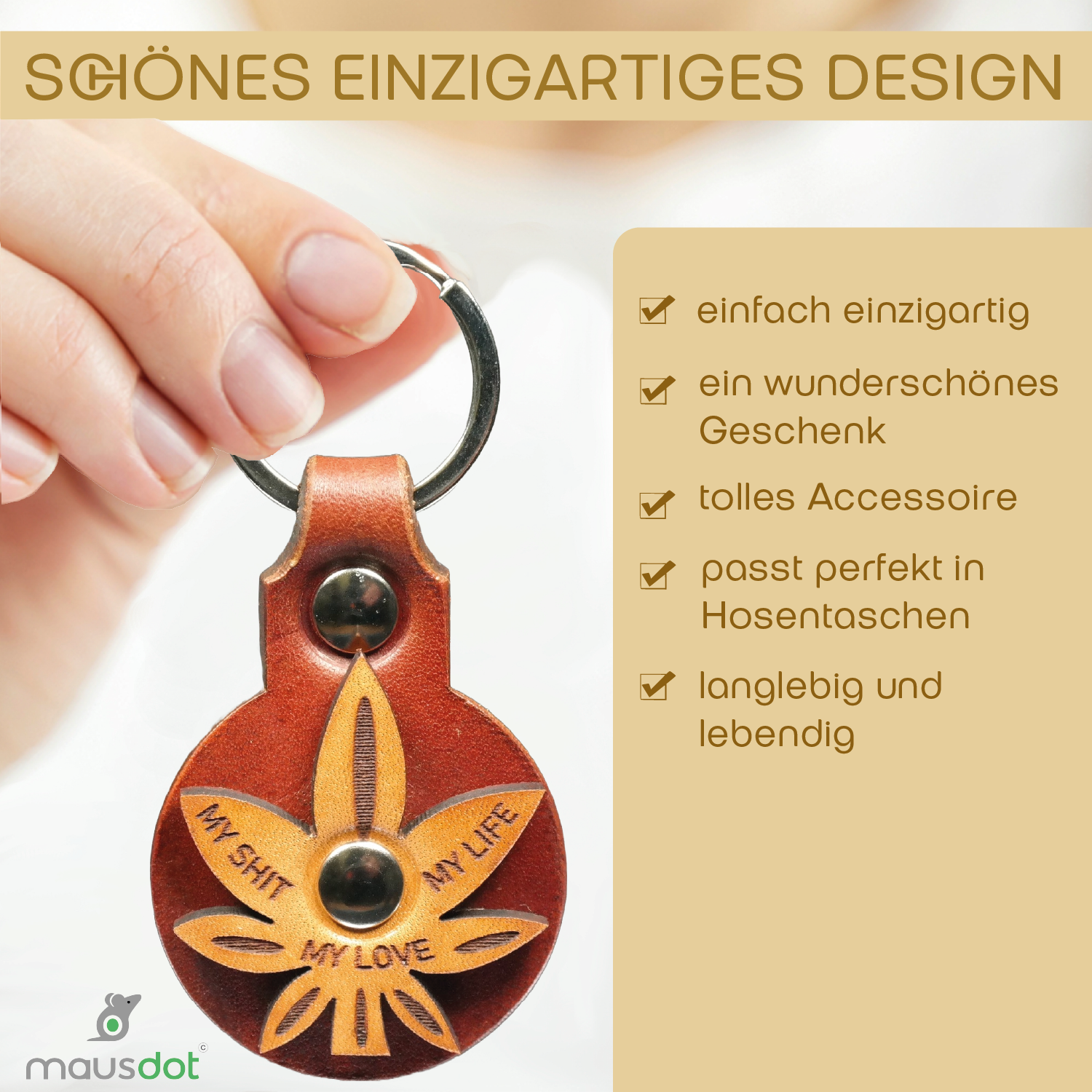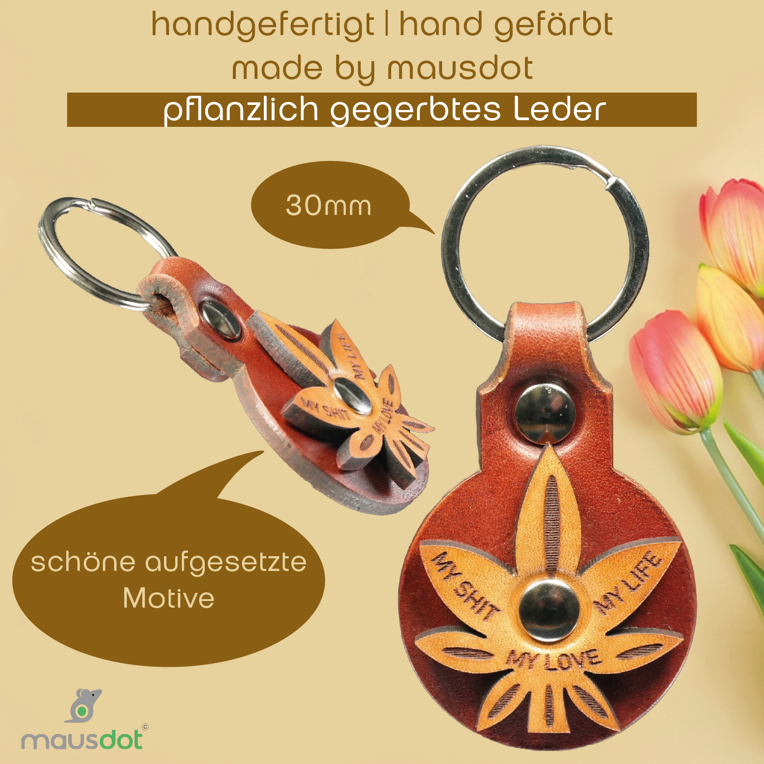 Der Mausdot Schlüsselanhänger mit einem fröhlichen Cannabismotiv aus dunkelbraunem und beigem Leder wird bei uns in Steinfurt komplett selber produziert. Wir gestallten alle Schlüsselanhänger selber. Der Schlüsselanhänger aus vegetabilem Leder wird sorgfältig von Hand gefärbt und zum Abschluss mit einem speziellen Micro Wachs gegen Abfärben und Wasser geschützt. Der Lederschlüsselanhänger mit dem Cannabismotive und dem Text MY SHIT MY LIFE MY LOVE ist ein echter Hingucker und ein wunderschönes Geschenk für besondere Anlässe.