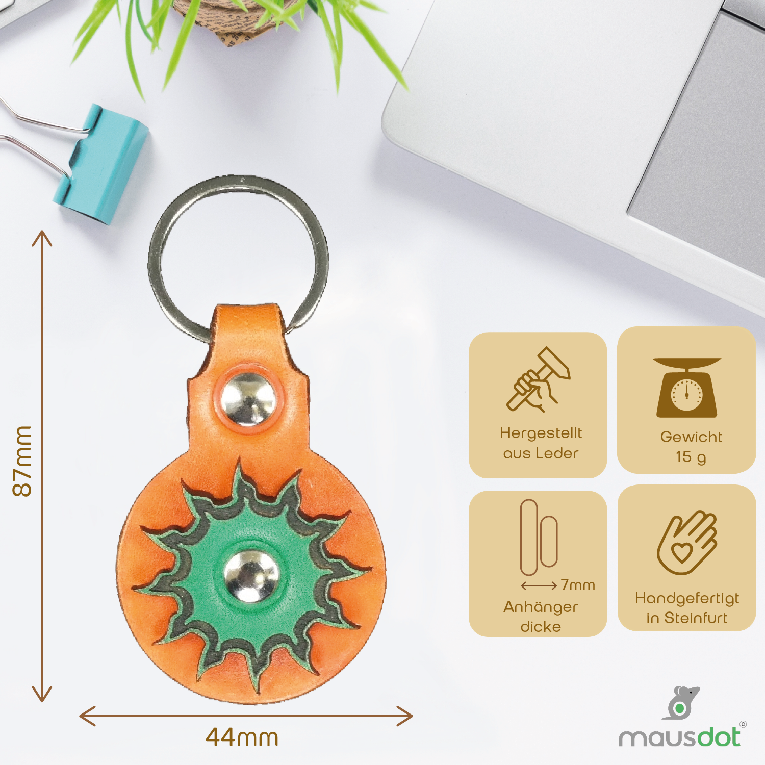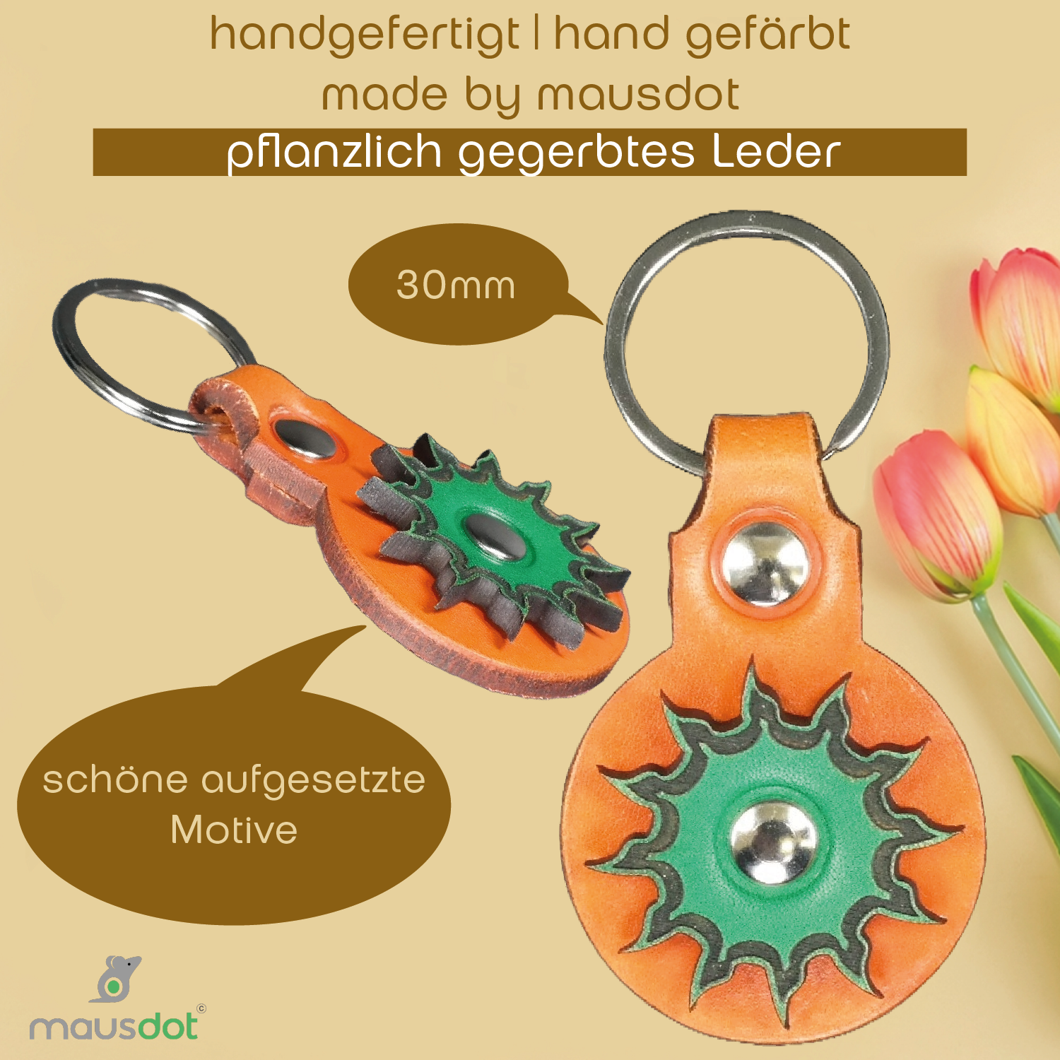 Der Mausdot Schlüsselanhänger mit einem fröhlichen Sonnenmotiv aus orange und grünem Leder wird bei uns in Steinfurt komplett selber produziert. Wir gestallten alle Schlüsselanhänger selber. Der Schlüsselanhänger aus vegetabilem Leder wird sorgfältig von Hand gefärbt und zum Abschluss mit einem speziellen Micro Wachs gegen Abfärben und Wasser geschützt. Der Lederschlüsselanhänger mit dem Sonnenmotive ist ein echter Hingucker und ein wunderschönes Geschenk für alle Anlässe.